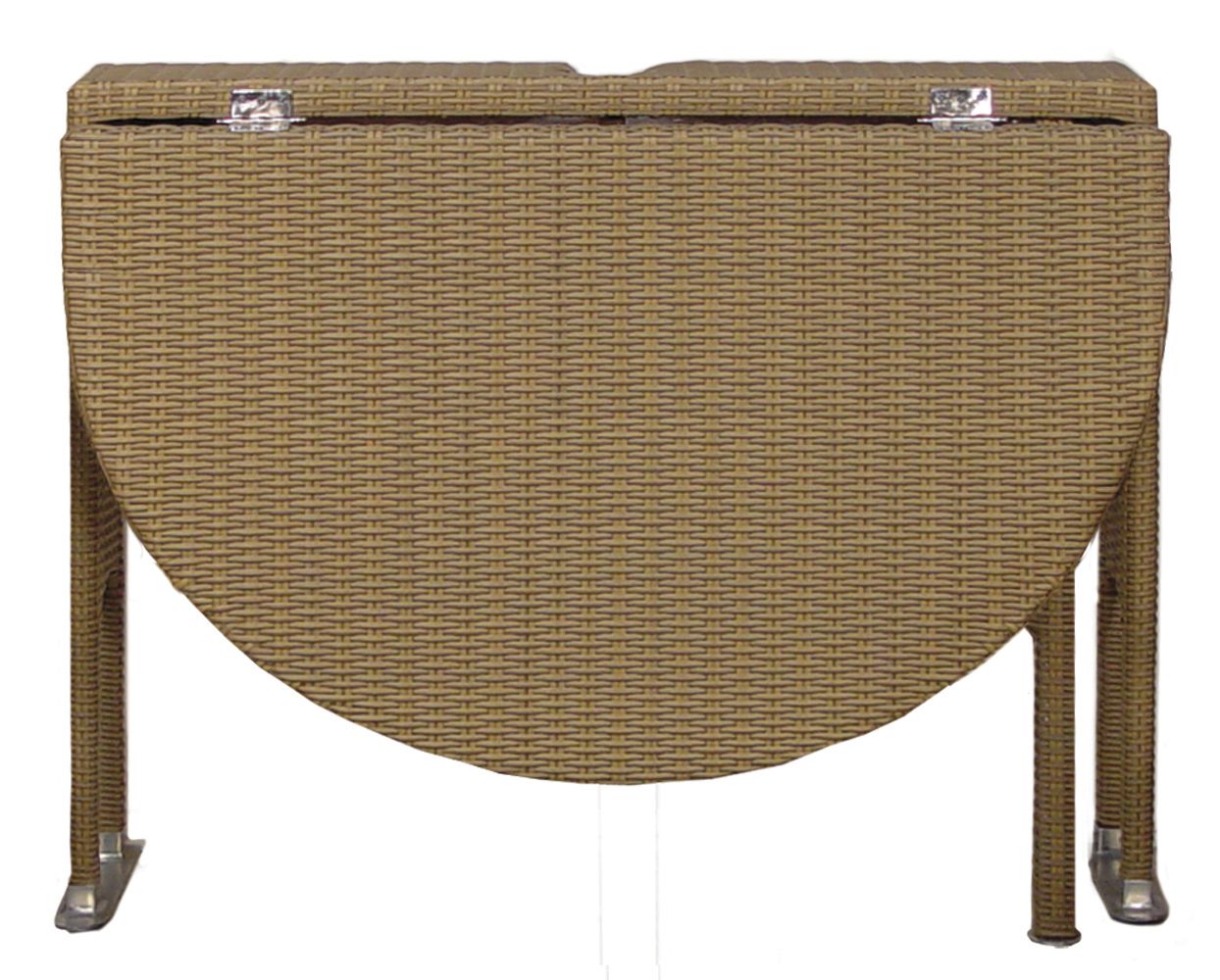 The stylish design of the Terrace Mates Genevieve All-Weather Wicker Oval Folding Half Table allows you the freedom to use your space your way. Enjoy more of your outdoor setting with this table. Fitting flush against the wall or vertical surface, it provides the perfect addition to complement your patio, deck, or balcony. The drop leaf, gate-leg feature lets you fold the top down so the table stands a mere 6 away from the wall. Crafted with an aluminum frame wrapped with high quality all-weather wicker to provide years of maintenance free durability. This strong, durable table can be conveniently folded and stored when not in use. Coordinates with Off-the-Wall Brella and Terrace Mates Stackable Armchairs (sold separately).
