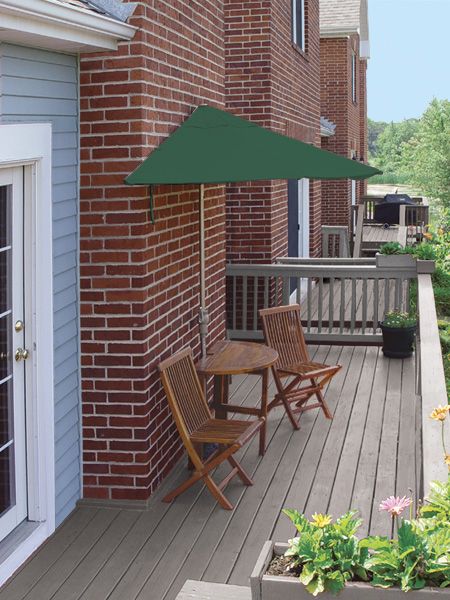 Enjoy Urban Outdoor Leisure Living at its very best. The CALEO Terrace Mates 5-Piece Set is an innovative design solution in the search for shade and ambience on balconies and terraces. Condominium and townhouse dwellers can transform a long ignored patio, deck or veranda into a vibrant addition to their lifestyle. Designed to stand without attachment in front of a wall, window or sliding glass door, the attractive 36 half-round, drop leaf, gate-leg table and comfortable folding side chairs feature the exclusive 7.5 ft. OFF-THE-WALL BRELLA half-canopy umbrella and 40 lb. Custom Cast Base. Canopy is made of Green Olefin fabric for long lasting color and durability. Champagne color powder-coated umbrella frame and base. When not in use the umbrella, table and chairs fold neatly out of the way to conserve space. Crafted from kiln-dried Nyatoh Asian Hardwood, the furniture can be teak oiled to preserve the wood grain or leave untreated for a gray patina. No assembly.
